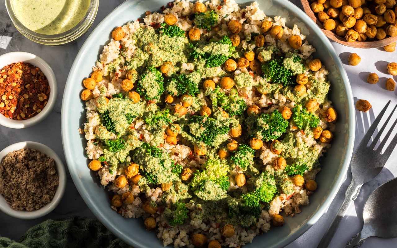 Leftover herbs get a second chance in this North African-inspired Moroccan Millet Bowl that’s equal parts bright, savory, and satisfying. A lemony millet base meets a spicy herbed tahini sauce (hello, chermoula!), and it’s all finished with crunchy chickpeas, steamed broccoli, and a sprinkle of dukkah. It’s a herby, no-waste kind of meal.