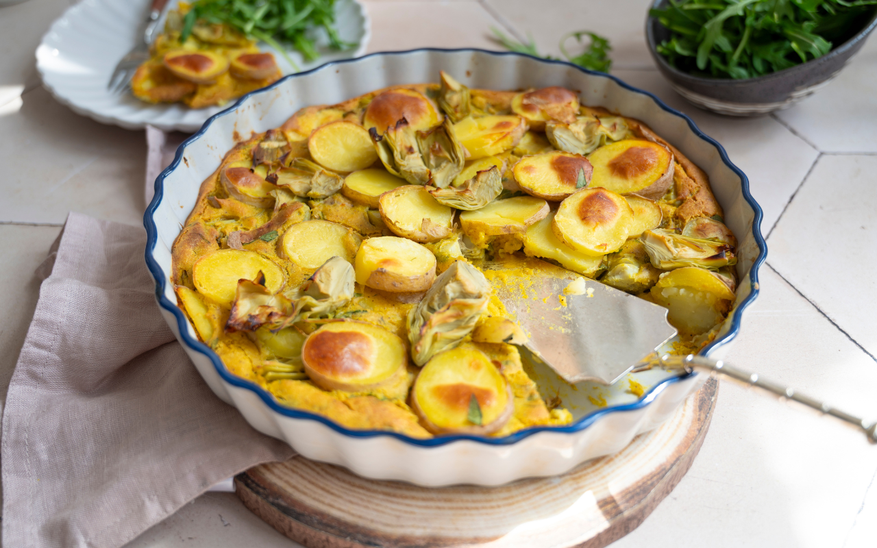 Leftover herbs in danger of wilting? This plant-powered Potato and Herb Frittata turns that handful of parsley, dill, chives — or whatever you’ve got — into the star of a satisfying, savory meal. With tender baby potatoes, a creamy chickpea flour base, and a hint of turmeric, it’s a comfort food that clears your crisper drawer.