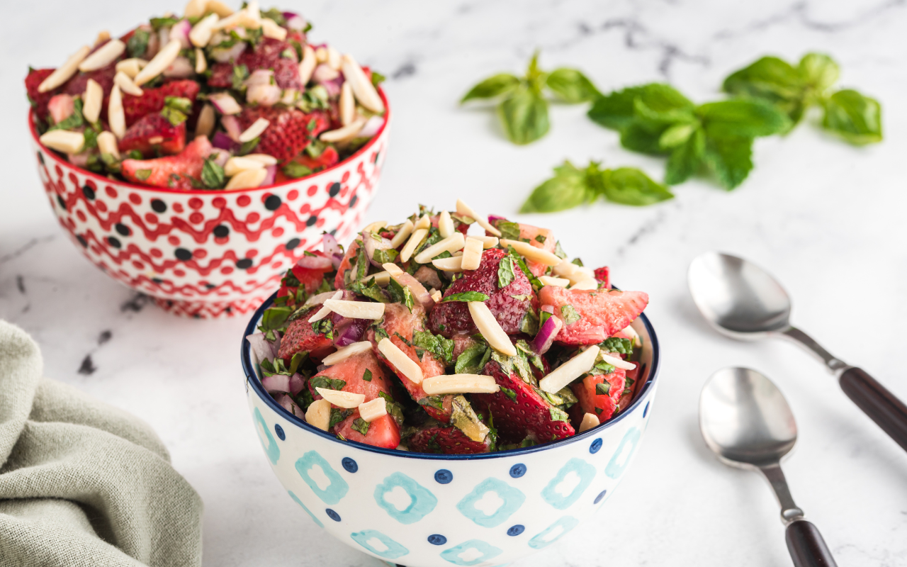 This fresh, summery salad celebrates ripe strawberries — and a clever way to use up extra mint and basil. The combination of juicy fruit, crisp red onion, and creamy tahini-lime dressing creates a sweet-savory balance that’s unexpectedly crave-worthy. Topped with slivered almonds for crunch, our Strawberry Mint Salad recipe is perfect for picnics, brunches, or any time you want to make a handful of herbs feel like the star.