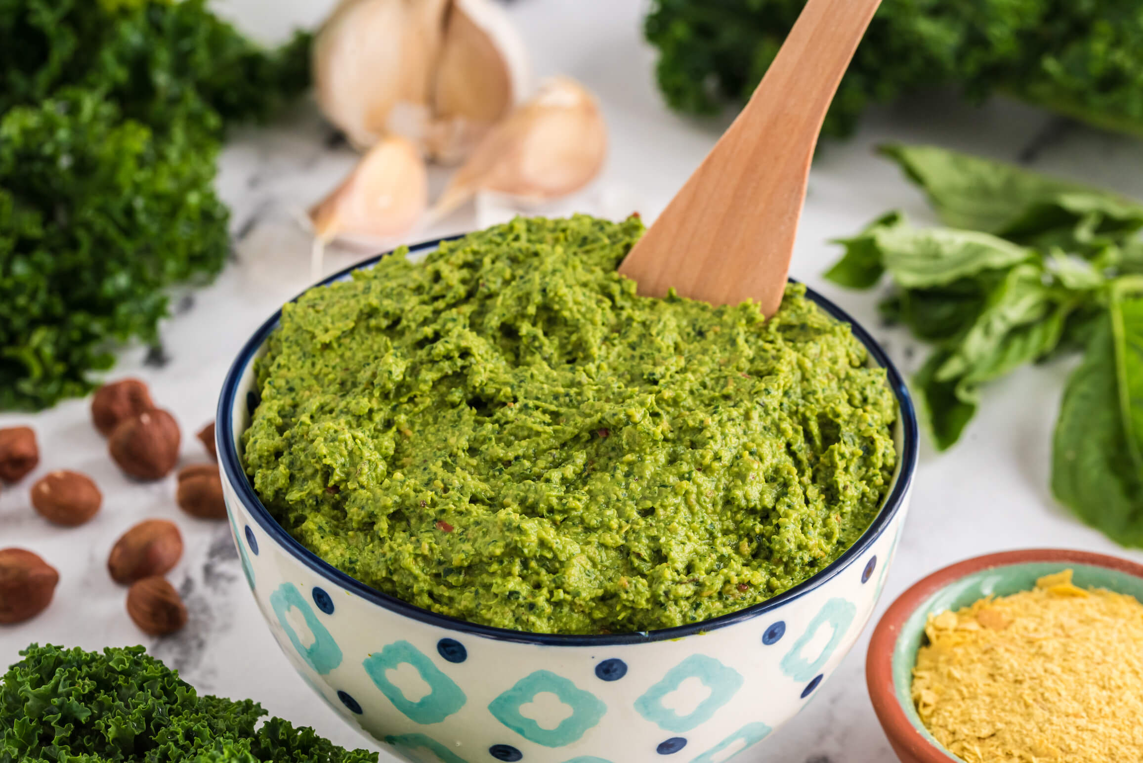 Hazelnuts add a nutty and slightly sweet flavor to what might just be our favorite pesto yet. They pair well with the rich avocado, peppery basil, and earthy kale, and also give this bold and vibrant spread the perfect bite and texture, similar to grated parmesan cheese. We wouldn’t be surprised if this becomes your favorite pesto, too!