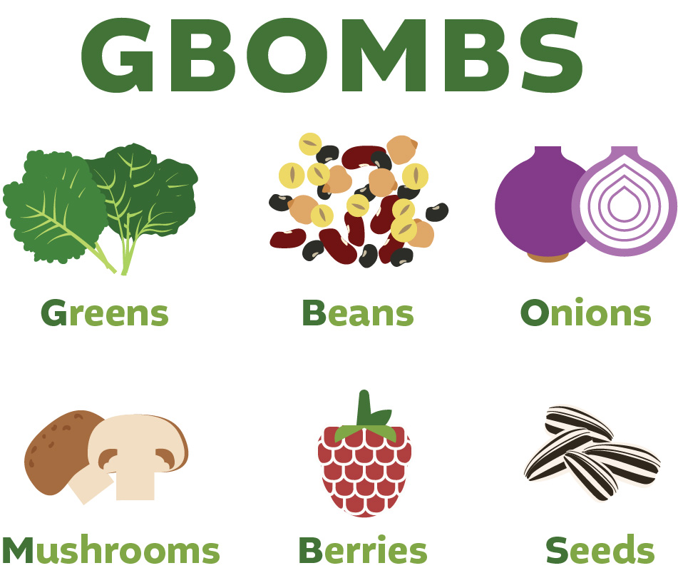 If you’re more ambitious or already familiar with GBOMBS in your diet, you can up your game by choosing one to include at each meal. Once you’re a GBOMBS pro, see if you can incorporate all six into each day. And if you’re an overachiever, try to get all six into one meal!