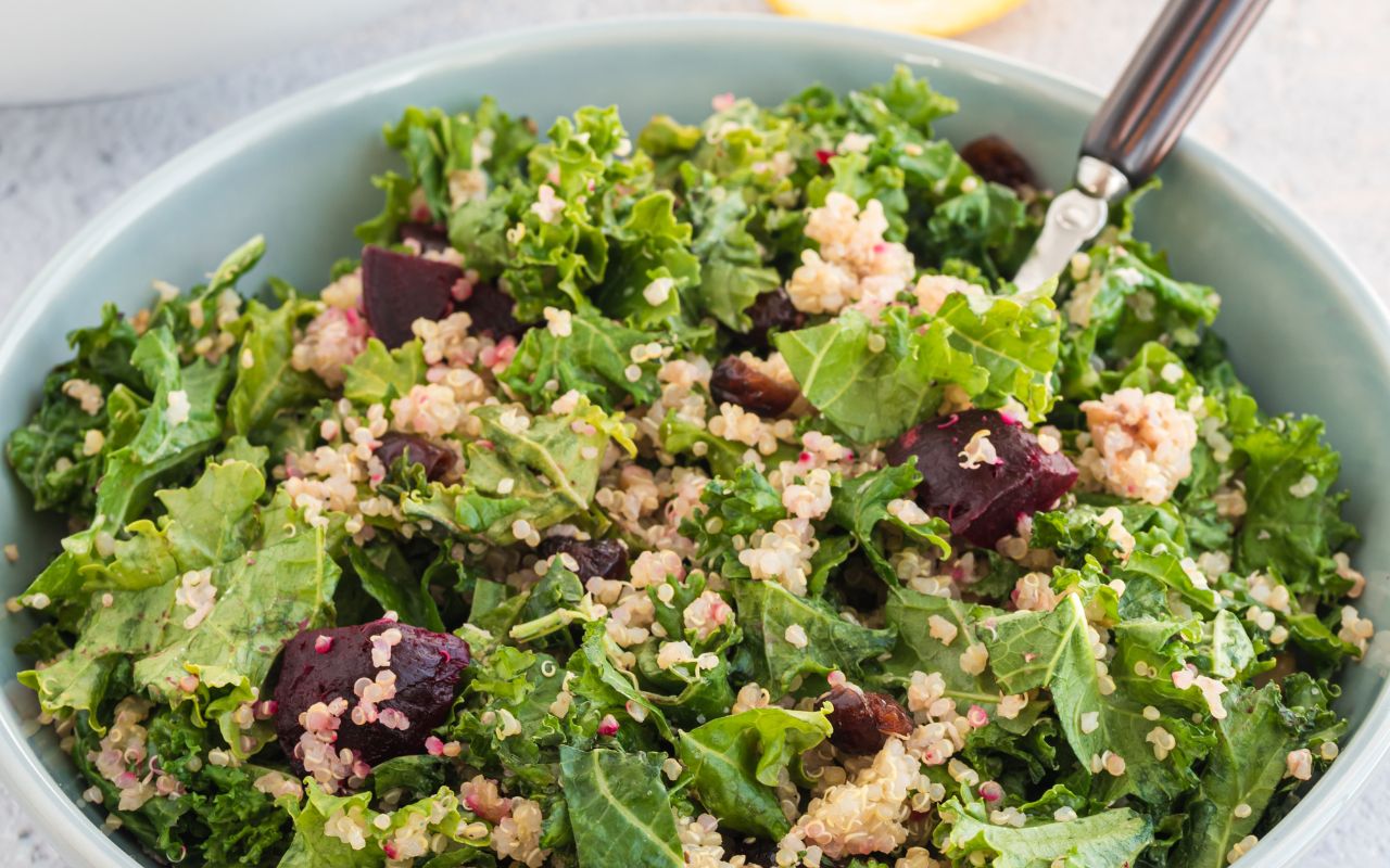 Our Plant Protein-Powered Salad is a vibrant mix of hearty amaranth, crunchy walnuts, and creamy avocado tossed with nutrient-packed kale. Including pomegranate seeds and pickled beets brings a punch of color and flavor, while a drizzle of tahini and lemon juice ties the salad’s tangy but earthy flavor profile together. With just seven key ingredients, this salad is an impressive, go-to meal for busy workdays.